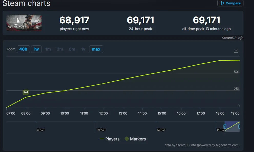 Windrose, the pirate-themed survival game that turned heads with a successful Steam demo earlier in 2026, has stormed into early access with an impressive opening day. According to Destructoid, the game has already pulled in just shy of 70,000 concurrent players - more than triple the peak player count from its demo period.